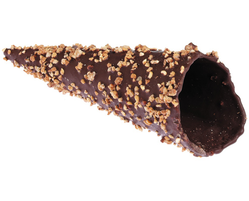 Oblátkový kornút s čokoládovou polevou s orieškovým posypom.