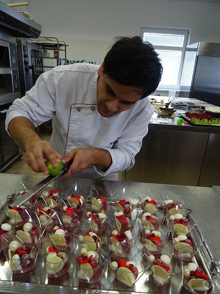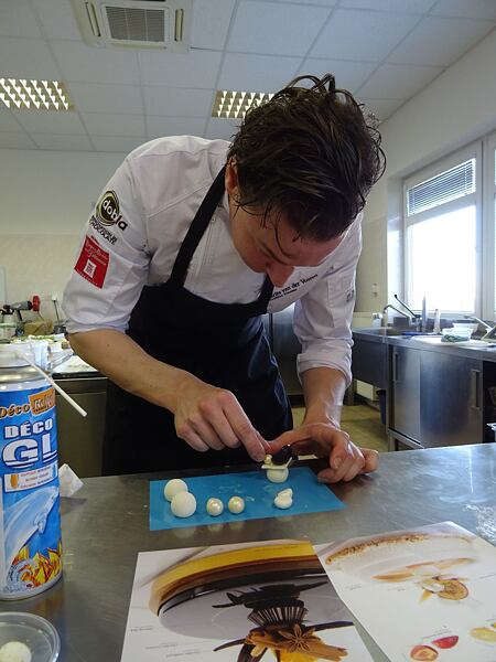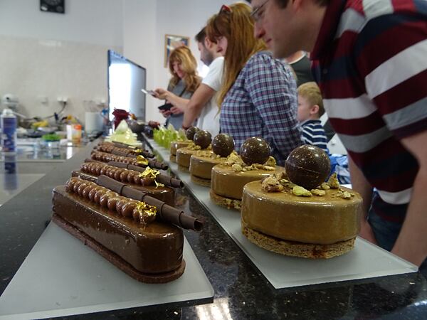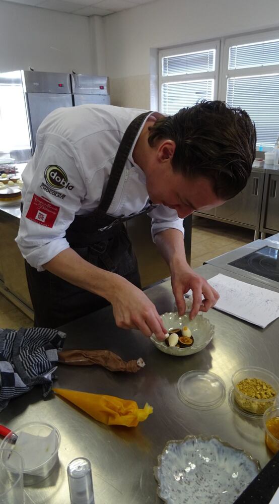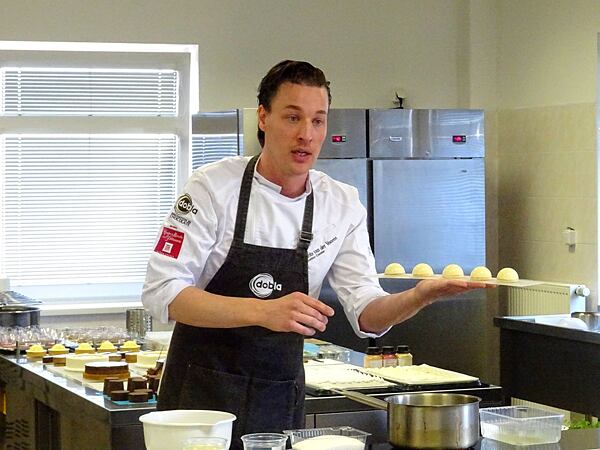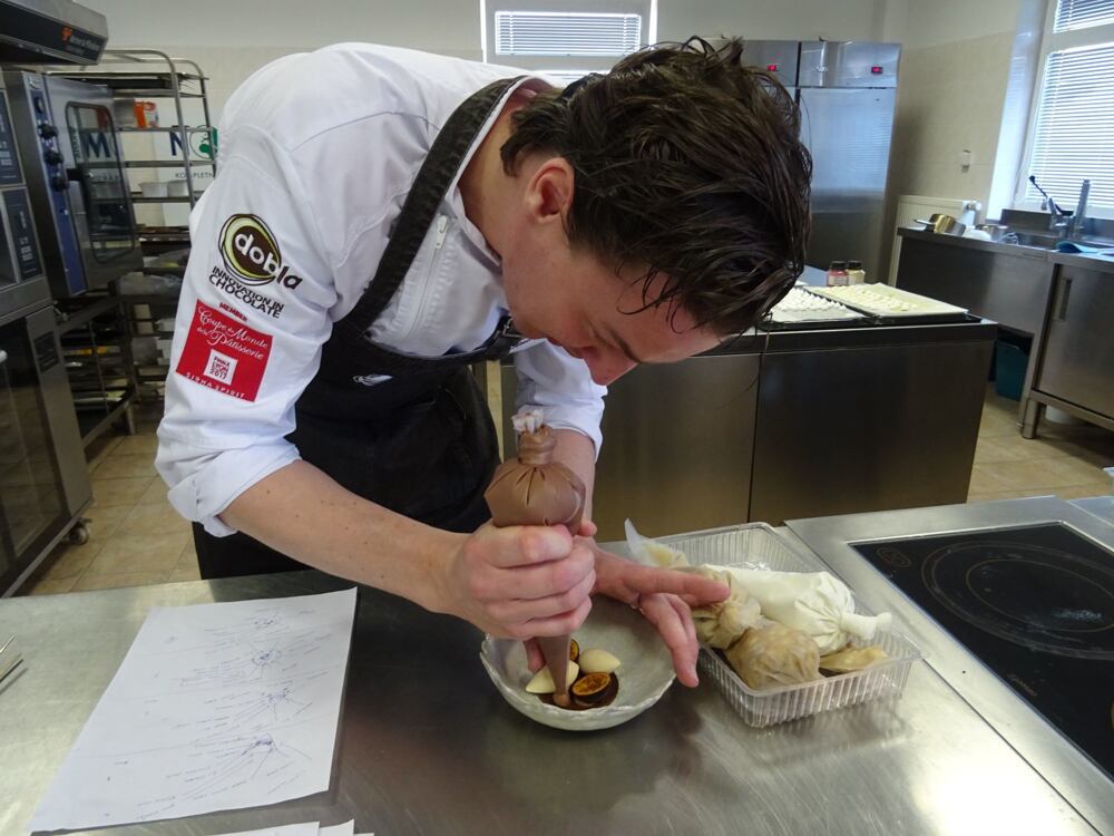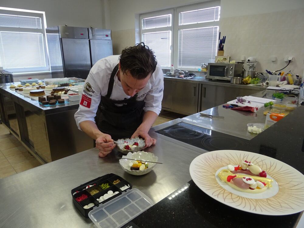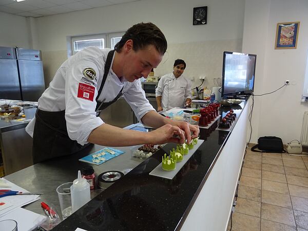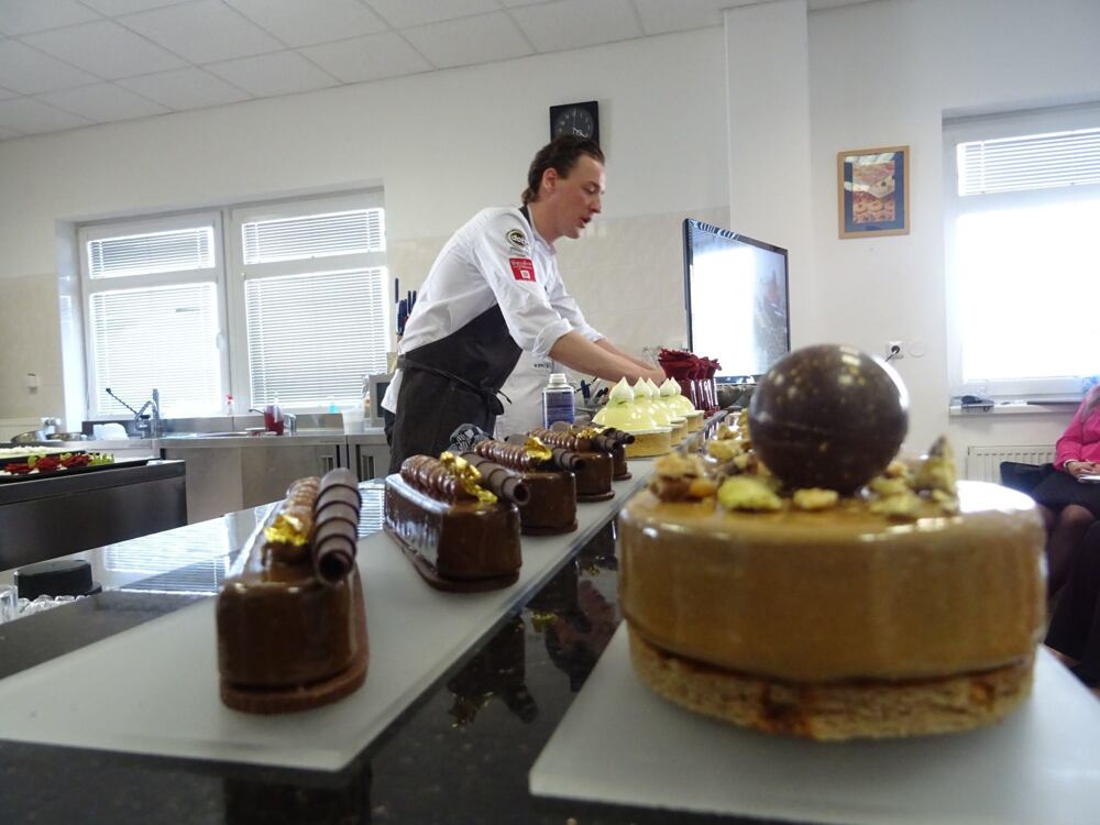 Jeho kreativita, znalosti a kombinace chutí oslovila účastníky v naplněném sále našeho cukrářského studia. Během zdobení byly použity také čokoládové dekorace našeho sortimentu od výrobce Dobla.