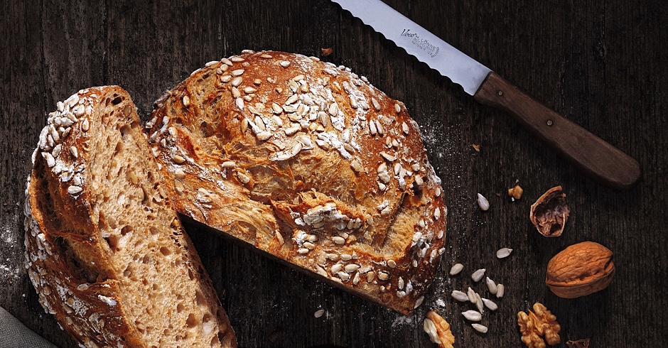 Řemeslný chléb KRACHER - vyroben ze směsi Pane Rustic. Delikátní chléb s žitným kváskem, jemnou, voňavou, mírně nasládlou střídou, v receptuře s vlašskými ořechy a slunečnicovými semínky. Krásně křupavá kůrka je charakteristická pro každý kus tohoto skvělého pečiva.