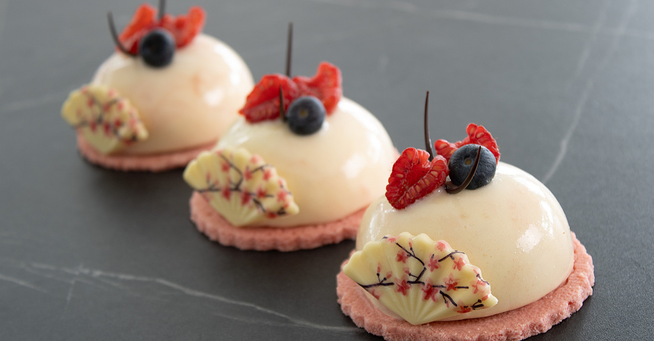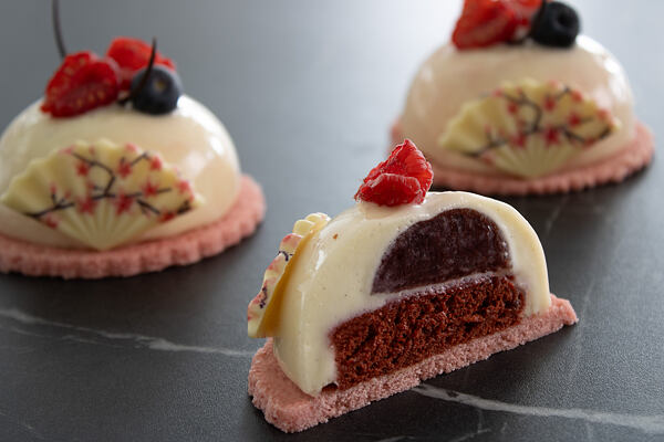 Do větší silikonové formy ve tvaru polokoule nalít do 1/2 mousse z bílé čokolády. Vložit zmražený ovocný coulis a dolít mousse do 3/4 formy. Přiložt vykrojené olečko z rez velvet plátu a dát do mrazáku. Po vymražení přelít tradiční polevou. Položit na linecký podklad a dozdobit dekorací - Vějíř sakura, Křivky tmavé.