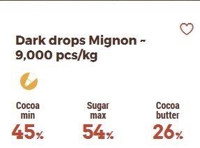 Ide o tmavú čokoládu 45 % s min. 29 % kakaového masla. Vynikajúce organoleptické vlastnosti. Vďaka vyššiemu obsahu cukru ju v pečive budete cítiť aj po zahryznutí.