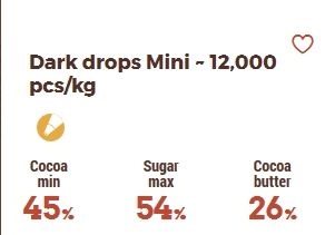 Ide o tmavú čokoládu 45 % s min. 29 % kakaového masla. Vynikajúce organoleptické vlastnosti. Vďaka vyššiemu obsahu cukru ju v pečive budete cítiť aj po zahryznutí.