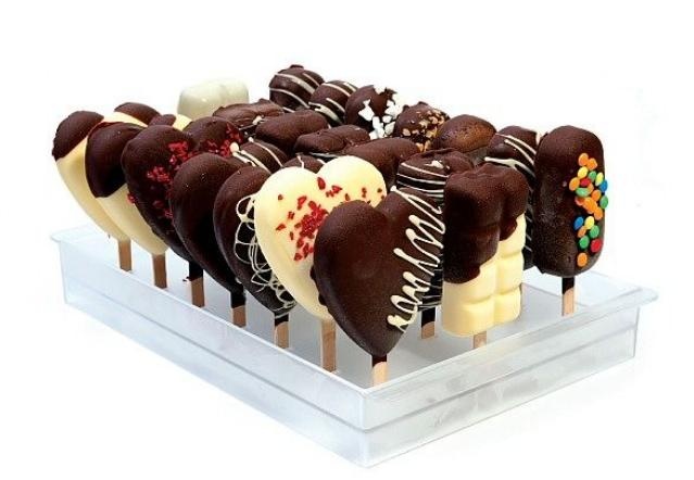 Stojan na nanuky, vhodný do vitríny. Na prezentáciu nanukov drievkom dole. Na cca. 21 štandardných kúskov.