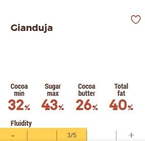 Excelentná nugátová čokoláda podľa tradičnej talianskej receptúry, charakterizovaná vysokým podielom lieskových orieškov (24 %) a kakaovej pasty. Bez pridaného mlieka.