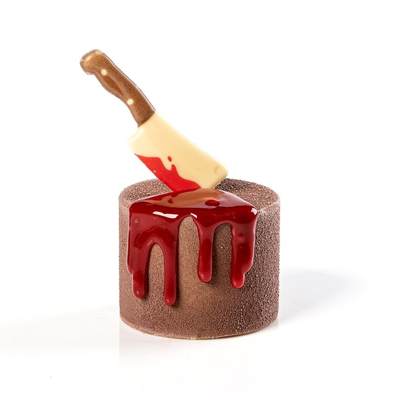 Dizajnový čokoládový mäsiarsky nôž s krvou. Rozmery: 6.9x2.1cm