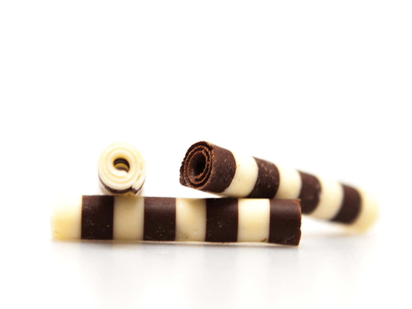 Rolovaná trubička pruhovaná z mliečnej a bielej belgickej čokolády.