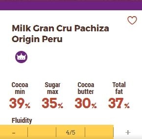 Mliečna čokoláda vyrobená z vybraných kakaových bôbov z údolia Central Huallaga nachádzajúceho sa v regióne San Martín, Peru.