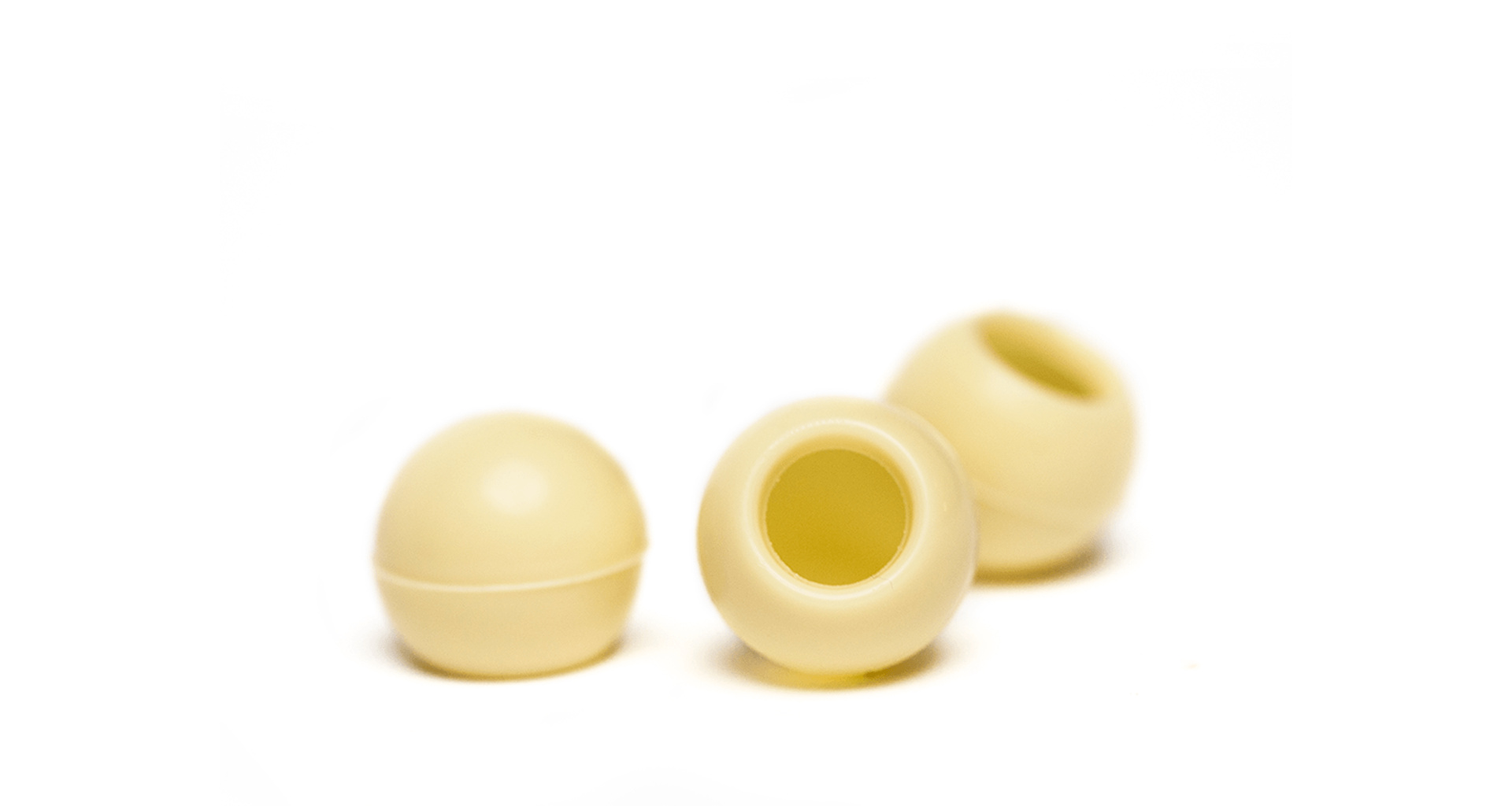 Škrupiny na pralinky z bielej belgickej čokolády pripravené na plnenie. Rozmer: ø 25 mm