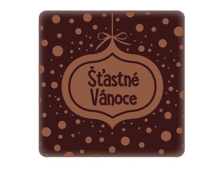 Vianočná štvorcová dekorácia z belgickej čokolády s nápisom Šťastné Vianoce. Rozmer: 3,8 cm