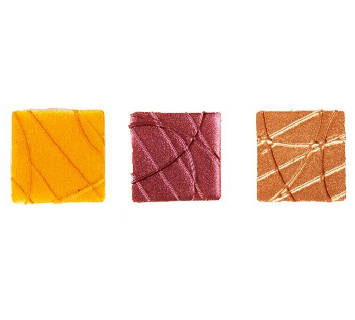 Tri varianty metalických perleťových štvorcov s dizajnovou linkou z farbenej belgickej čokolády.