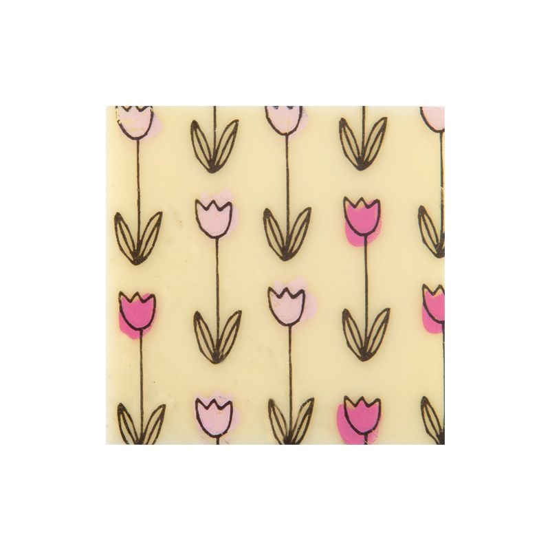 Štvorec z belgickej bielej čokolády s motívom tulipánov.