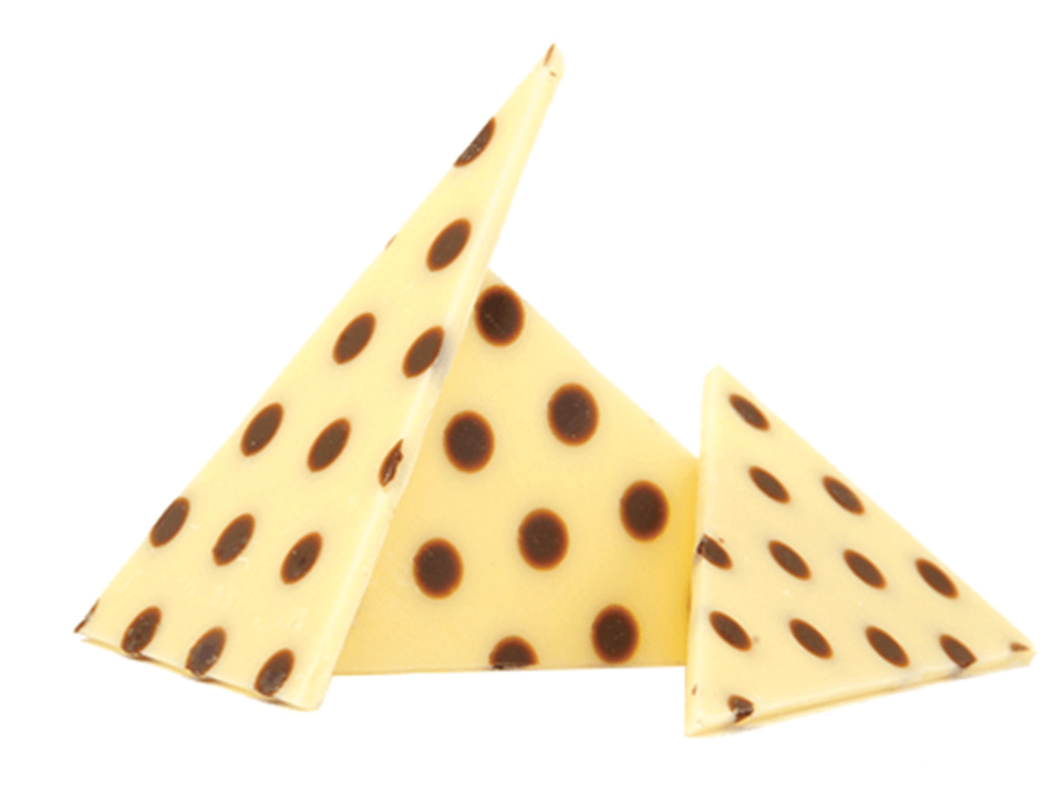 Čokoládová dekorácia z bielej a tmavej belgickej čokolády s bodkami. Rozmer: 35 x 55 mm