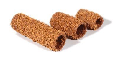Oblátkové pečivo s tmavou polevou sypané mandľami na plnenie. Rozmer: ø 20 mm/92 mm