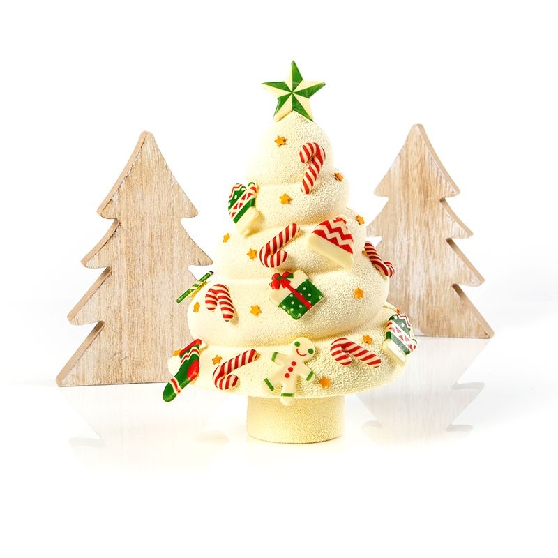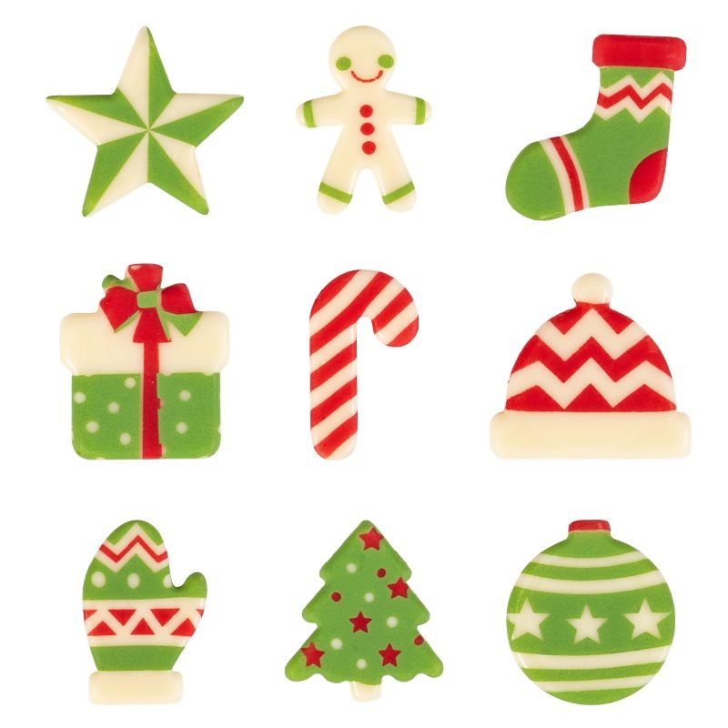 Hravé dekorácie z bielej čokolády s motívmi Vianoc. Rozmer: 3 cm