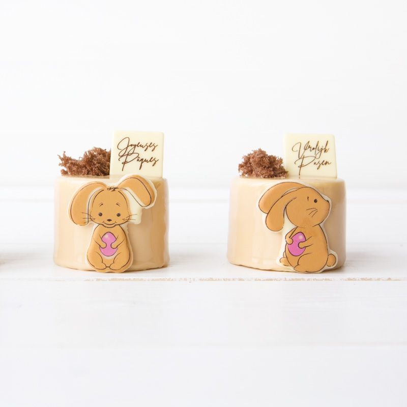 Motívy štyroch zajačikov s vajíčkom na doštičke z bielej belgickej čokolády. Rozmer: 4.4x4cm